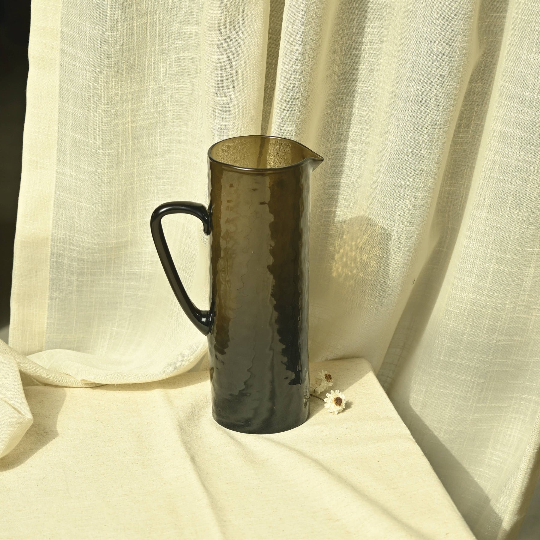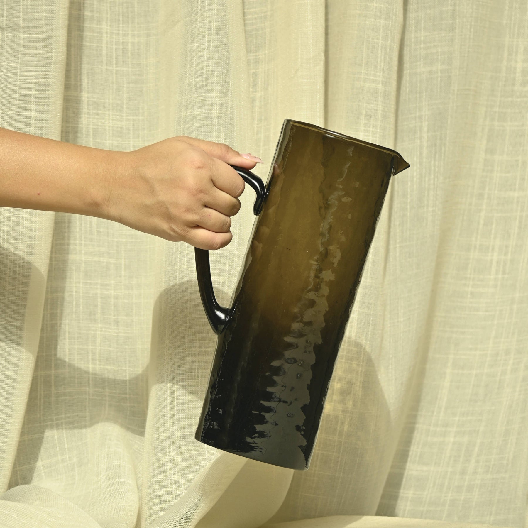 Crafted in Firozabad, India with artisanal precision, this handblown pitcher is made from high-quality, durable pot glass that is non-toxic. Its texture adds a unique raw touch to any table, while the distinct brown color brings a stylish accent to your basic drink ware. It also has a beautiful soft purple hue in sunlight. Perfect for both hot and cold beverages, this jug is strong and sturdy, making it a must-have for any home. • Material - Glass • Hand Made by artisan • Fill with lukewarm water with dish soap and wipe with a soft cloth to dry